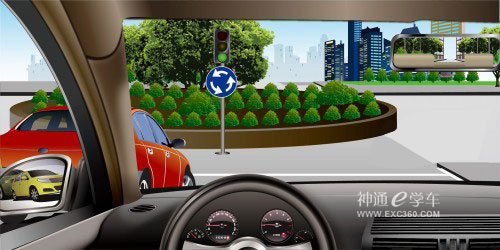 | 如图所示,在这种情况下准备进入环形路口时,为了保证车后车流的通畅,应加速超越红车进入路口。 | |||||