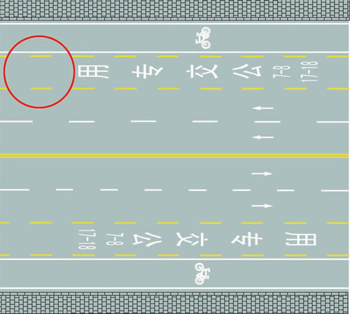 | 路中心黄色虚线的含义是分隔对向交通流,在保证安全的前提下,可越线超车或转弯。 | |||||