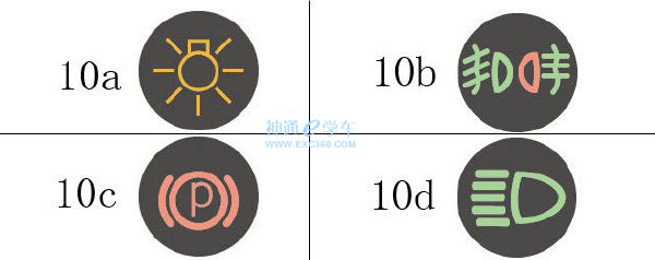 | 下列哪个指示灯亮表示车辆在使用远光灯?(图10a. 10b. 10c. 10d) | |||||||||