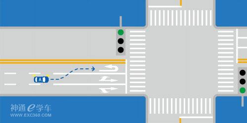 | 如图所示,A车要在前方掉头行驶,可以在此处变换车道,进入左侧车道准备掉头。 | |||||
