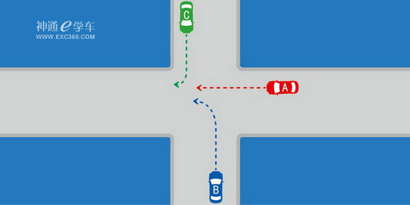 | 如图所示,在这种无信号灯控制情况下,A、B、C车的通行权顺序是什么? | |||||||||
